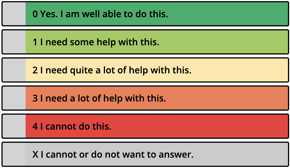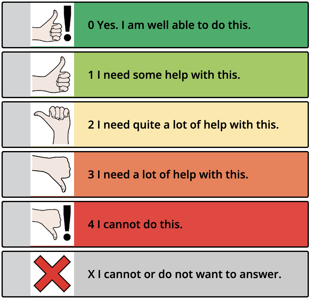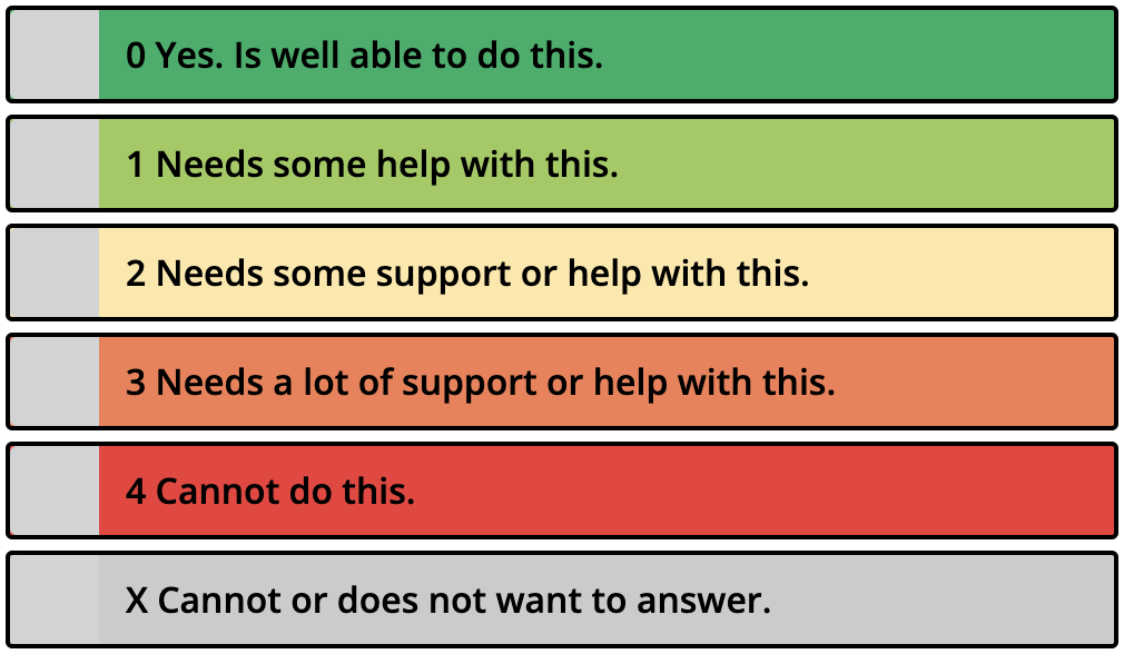 Jos sinulla ei ole riittävästi tietoa kuvata oppilaan toimintakykyä asteikolla 0–4, valitse silloin rohkeasti "En osaa tai halua vastata". Osaan kysymyksistä vastataan K/E (kyllä/ei) tai kirjoittamalla vastaus vapaaseen tekstikenttään.